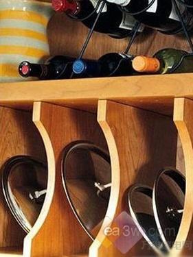 盖子巧收纳将各种锅盖与锅子分开。每个锅盖放在一个格子里,使用时也很方便拿取。
