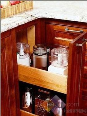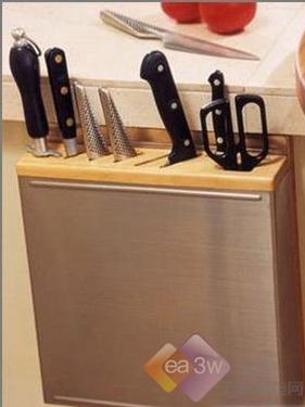 把刀具等利器放在一个不锈钢的盒子里。盒子可以固定在柜台的一侧。如果家里有小孩子,那盒子最好安在橱柜门的内侧。