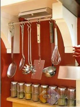 把各种用具挂在s挂钩上,就挂在炉灶上方。挂杆用普通的毛巾敢就可以充当,省钱。
