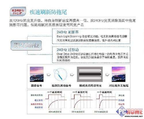 第二个240Hz是指采用了240Hz的Over Driving过驱动:240Hz过驱动通过把地址电极上的电容注电压方式由缓压提升为过压,以达到加速液晶分子偏转速度,提升响应时间的目的。通常的60Hz面板采用2伏缓压方式,120Hz面板采用4伏稳压方式,而类似康佳LC55FT68AC这样的240Hz面板采用6伏过压方式。
