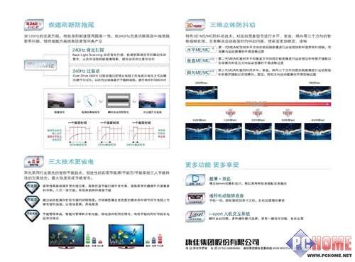 双240Hz+FHD技术俗称“第三代运动高清解决方案的核心技术”,通过240Hz背光扫描+240Hz过驱动+全高清的组合方式迅速缩简前帧图像残影显示时间并加速液晶分子偏转速度从而彻底解决液晶大平板显示运动画面的残影和拖尾问题。3D ME/MC技术俗称“三维立体防抖动技术”,通过对运动图像进行水平、垂直、斜向三个方向智能插帧处理,完美解决运动图像的抖动技术难题,还原稳定、真实的运动画面。有别于其他节能产品简单的降低屏幕亮度来达到节能的噱头,康佳3路智控节能技术,采用节能屏,节能芯片,节能系统3方面对整体功耗进行智能化控制,使得LC55FT68AC最高节能可达52%。