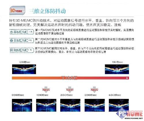 第三代ME/MC技术名为斜向ME/MC:TV主芯片能同时对水平、垂直、斜向三个方向的前后帧图像进行运动预估和补偿并插帧以实现横向、竖立、斜切方向运动图像的平滑流畅过渡。