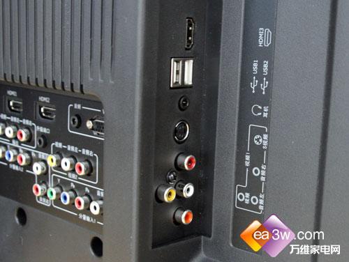 在机身侧面,海信TLM47P69GP液晶电视设置了1路HDMI接口、2路USB接口、1个耳机接口、1路S端子及1组AV输入,非常齐全,对于常用音视频及数码设备的连接都可以满足。特别一提的是,海信TLM42P69GP(参数 图片 论坛)所提供的HDMI接口为1.3版本,上面的注释也有标明,相对于普通1.1/1.2版本的HDMI接口来说,输出的带宽从165MHz增加到了340MHz,支持帧频从60Hz增加到了可以支持72Hz、75Hz、90Hz,并且还可以支持PS3、蓝光DVD等高清设备的连接,更加实用。