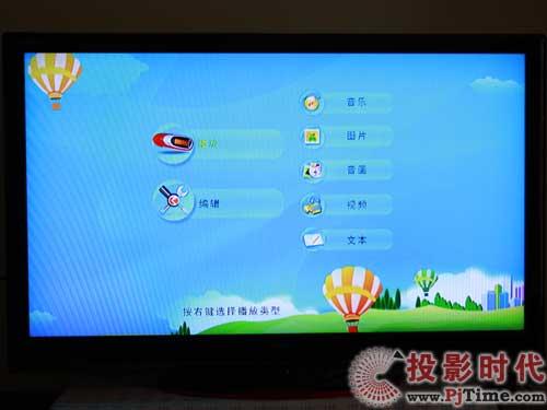 在插入USB设备后,切入到USB信号源下,康佳LC55FT68AC液晶电视就会弹出相应的界面,其中包括播放音乐、图片、音画同步、视频、文本等文件,整个界面还配有非常舒适的背景,给人一种清新爽朗的感觉。