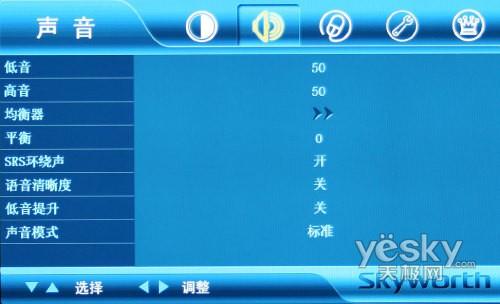 在声音菜单中,我们可以对低音,高音,均衡器,平衡,SRS环绕声,语音清晰度,低音提升,声音模式等功能进行详细设置。在SRS环绕声打开后,可以享受到TruSurround Xt技术处理音效。而在声音模式中,我们可以选择“标准”“音乐”“新闻”“影院”“自设”五种声音模式。