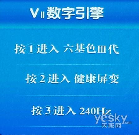 在高级菜单中,我们可以对六基色III代,健康屏变,背光调节,屏稳,240HZ,重低音开关,重低音音量,开关机音乐等功能进行设置。其中,六基色III代是本机的一大亮点。它分为“优化”,“增强”,“彩色演示”,“动态演示”,“关”几项功能。“优化”功能表示在原来基础上优化各种彩色参数;“增强”功能表示在原来基础上色彩增强;“彩色演示”功能表示画质优化前后做静态效果对比;“动态演示”功能表示随着扫描线的左右移动,动态的演示六基色技术处理前后的图像对比。