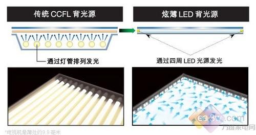 索尼40ZX1采用了白光LED边光源,与传统LCD光源组件和投射原理相比,LED侧光源由机身两侧或四周发出光源,通过内置的高透光率的导光板的作用,使光线投射到面板上。限制LCD厚度最大的就是荧光灯的厚度,侧光源位于两侧的投射位置,使得其并不占据电视厚度的空间。