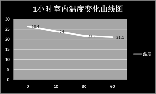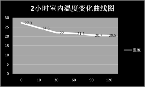 室内温度测试结果分析: 通过温度变化曲线图分析,在前30分钟之内,室内温度直线下降,最后恒定在22摄氏度;90分钟过后,温度保持在20.7摄氏度;90分钟-120分钟之间,温度一直恒定在20.7-20.5摄氏度之间。
