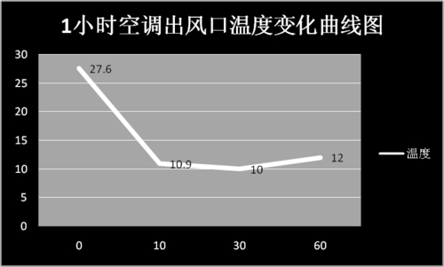 出风口温度测试结果分析:首先,通过出风口的温度变化曲线,可以看出空调在前10分钟内的变化非常明显,室温从27.3摄氏度迅速降至10.9摄氏度;随后的15分钟,出风口温度基本保持在10-11摄氏度之间;30分钟之后,出风口温度恒定在10-12摄氏度。