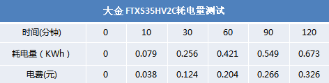 测试结果分析:通过很直观的数据,我们可以了解到,大金这款直流变频空调在省电方面表现还是比较不错,前半小时消耗0.256KW/h电量,2小时候消耗了0.673KW/h电量,也就是用户使用空调两小时要花费0.326元,对于一款1.5P的空调来说耗电量上表现的还是比较好,再加上R410A新冷媒的采用,可以说是一款非常环保的空调了。