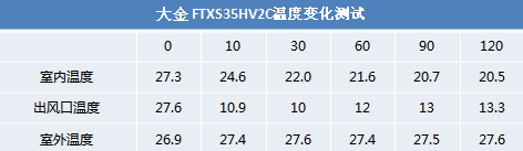 温度测试总结:大金 FTXS35HV2C是一款直流变频空调,产品在制冷效果与节能方面表现的比较出色。空调在设定温度后快速的调节室温,出风口的温度变化也比较明显,对于这款产品来说满足了用户在节能方面的使用需求。