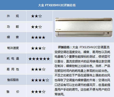 大金 FTXS35HV2C空调是一款直流变频空调,产品运用环保的新冷媒制冷剂。对于这款产品,我们将会在室温变化、耗电量、噪音这三个指标上进行测量。