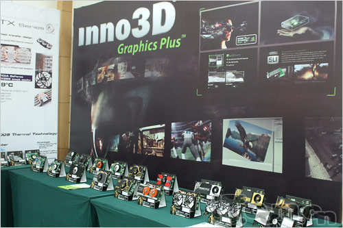 本次峰会的主题为“绿色动力”!在本次峰会上,映众(Inno3D)为现场来宾展示了多款绿色节能的主流显卡产品,包括全球最强的GTX295 单PCB版显卡,GTX275冰龙金牛收藏版、冰龙GTX260+金牛收藏版、Geforce 9800GT等等。这些显卡产品除了拥有强悍的游戏性能之外,另外一个最为重要的特点就是绿色节能。随着显卡性能的提升,显卡本身的功耗也越来越大,其所耗费的电源也越来越多。特别是对于网吧而言,电费支出在网吧运营开支中占了很大的比例,采用中高端游戏显卡无疑会给网吧带来很大的成本压力,同时,高功耗还会令产品的稳定性大打折扣,影响产品的寿命!为了解决这一问题,映众(Inno3D)专门为网吧用户打造了绿色节能版显卡,在保持产品性能的同时,尽最大可能地降低显卡的功耗与发热,帮助网吧业主们有效地节省电费支出!同时,更低的发热还可以令显卡运行更加稳定,给网友带来更畅快的游戏体验,同时令显卡的寿命大大延长!
