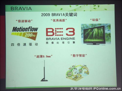 最后,高明先生指出了2009年BRAVIA关键词,“倍速驱动”、“优秀画质”、“环保”、“超薄”、“数字智能”是今年索尼产品突出亮点,同时也代表着行业的发展趋势。