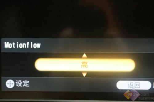 在Motionflow功能选项中,分别有高、标准和关三个档位可供调整。在高标准中,对比其它档位,画面明显流畅很多。在关掉Motionflow功能收看模拟信号(普通电视节目)时,可以明显看出画面虚影。