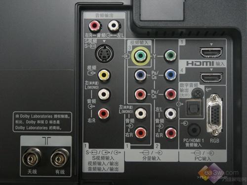 | 输入端子 | 电脑接口+音频输入 天线输入端子(VHF/UHF): 2 S视频输入端子: 1 视频输入端子: 3(1侧置) Y.PB/CB.PR/CR分量视频输入端子: 2 |