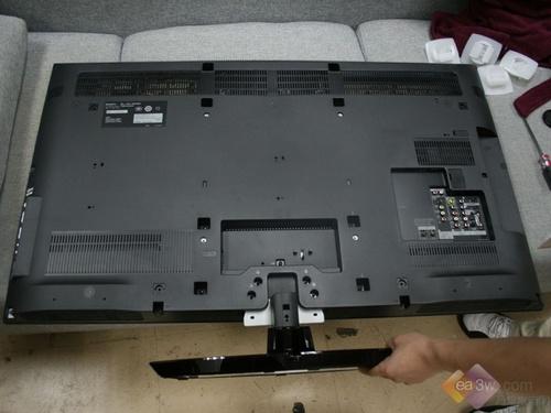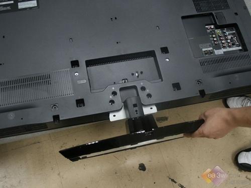 索尼46Z5599采用了机身和底座分离式的设计,不过安装起来十分方便。插槽和螺丝的位置设置十分显眼,只需对准插槽将四个螺丝固定即可。