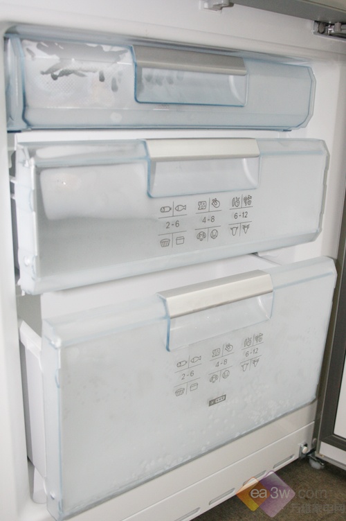 博世KGF25846TI拥有57L冷冻室容积,足够三口之家使用,冷冻室主体被分成三个部分,不同容积的抽屉可分别存放不同体积的物品。在冷冻室抽屉上,细心的标出了每种食品适宜的冷冻存储参考期限,比较人性化。