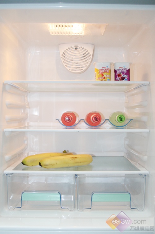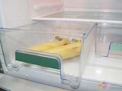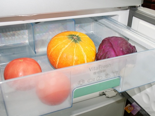 维他保鲜室分上下两个抽屉,可以根据食物的不同来选择不同的抽屉存放。下层抽屉由于上方的保湿搁板而湿度较高。