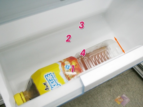 下面,是这款冰箱的底层抽屉实物演示图,照这样排放,冷冻4瓶2L的饮料没有问题。