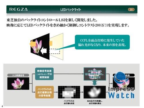 区域驱动如果充分地精细得驱动单个区域单位,「明亮的像素明亮,暗的像素很暗」就可以。东芝没有公布REGZA ZX的LED件数,不过其件数与55ZX8000和46ZX8000不同通过采访已经得到了确认。