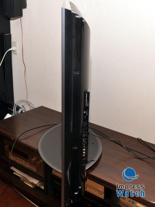 最近也许是因为看惯了薄型液晶电视,从侧面看实际厚度为11.3cm,与同型尺寸的CCFL机相比薄了约10%左右。重量包含底座为42.5kg(显示器部37.2kg)。而与之竞争的索尼RGB LED背光液晶电视BRAVIA「KDL-55XR1」光显示器部就重达47.5kg,不过松下的等离子电视「TH-54Z1」显示器部只有32kg比REGZA轻。