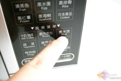美的EG720FA5-NS(睿蒸A5)微波炉采用轻触薄膜电脑板操作,在蒸气菜单具有“清蒸鱼、蒸水蛋、蒸排骨、蒸红薯、蒸海鲜、冷冻食品”六种菜单选择。