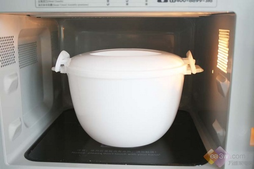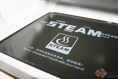 这款微波炉还随机赠送了一个“食神蒸霸”,它用来蒸各种食物,在容器中放入适量的水(加热小于十分钟的话,加水量300ML以下,时间越长,加水越多),然后将食物放在蒸屉上即可。