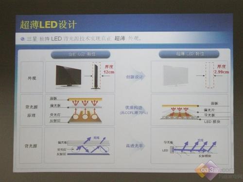 再说直下式与侧入式的区别,根据上图我们可以看出,与传统LCD光源组件和投射原理相比,LED侧光源由机身两侧发出光源,通过内置的高透光率导光板的作用,使光线投射到面板上。限制LCD厚度最大的就是荧光灯的厚度,侧光源位于两侧的投射位置,使得其并不占据电视厚度的空间。