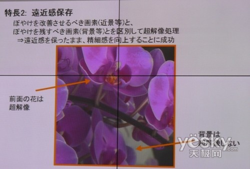 通过分析输入影像的亮度信号计算出解像度,然后对画面的多个部分同时进行超解像处理”。因此,可分别为同一画面上同时显现的SDTV影像与HDTV影像变换处理内容。另外,可识别出高清晰部分(近景等)以及模糊部分(背景等),然后进行超解像处理,因此不会破坏画面的距离感(纵深感)。