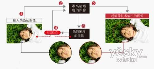 而对于边缘及细节部分,超解像技术先对这些画面进行放大以达到高清画面的分辨率,再通过放大后的分辨率与原始画面分辨率之间的函数关系,对放大后的画面进行缩小与原始画面进行比较,存在差异的地方通过一种“互相借鉴”的补偿方式进行操作,以得到最佳状态的影像后,再做最后输出。