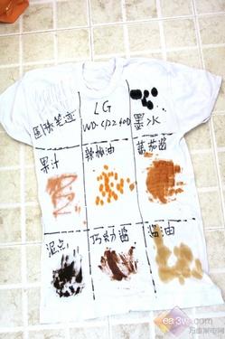 1.将污染物分不同区域按定量涂抹在白色T恤上。其中污染物为日常生活中最常见的:辣椒油、酱油、果汁、番茄酱、墨汁、圆珠笔迹、泥点和巧克力。