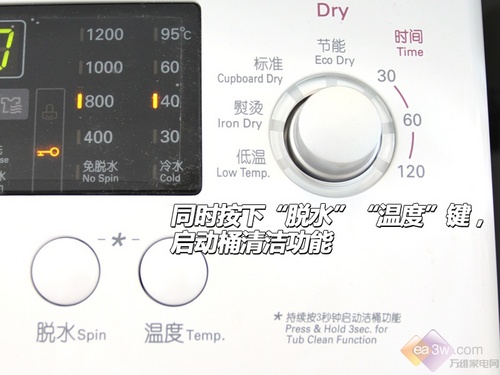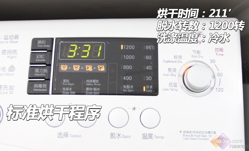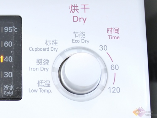 此外,由于这款机器带有烘干功能,所以特别设有烘干程序选择钮。可以根据标准、节能、熨烫、低温四项来选择烘干程序,另外,还可根据温度来选择,分为30℃、60℃、120℃。