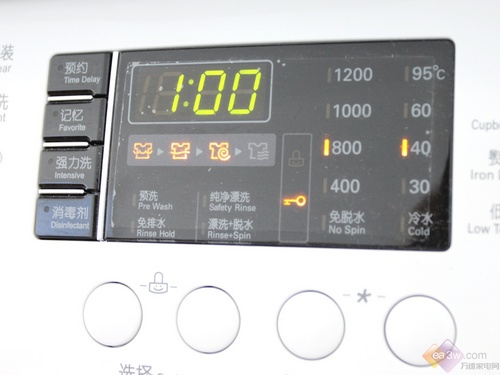 在显示屏的设计上,这款机器采用了一整块超大的LED显示屏,并且显示屏信息量十分庞大。在显示剩余时间的同时也显示了脱水转数;洗涤温度;是否预洗、免排水、纯净漂洗;门锁是否开启等信息。