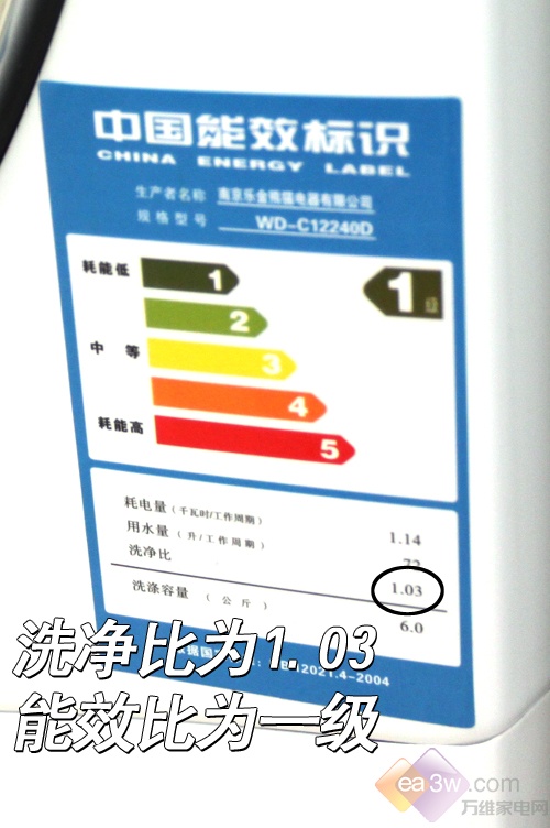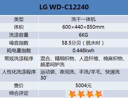 这款LG WD-C12240的能效等级为一级,比较节能。洗净比为1.03,属滚筒洗衣机正常洗净程序。