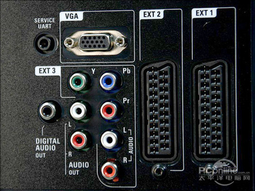 56PFL9954H提供了主接口区和侧置接口区,其中主接口区分为上下两个部分,其中上部接口区配置了1组VGA接口,2组Scart接口,1组色差接口、1组AV接口,以及一个数字音频输出接口。