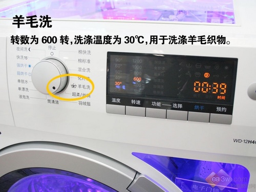 跟所有高端滚筒洗衣机一样,这款机器同样配备了羊毛洗程序,较低的600转转数和适中的30℃,用来洗涤可用于机洗的羊毛织物。不过需要提醒大家的是,在洗涤贵重衣物之前,需要先进行测试,不要贸然尝试。
