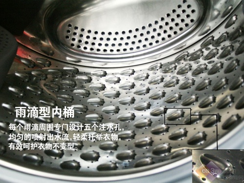 此外,雨滴型内桶和“S”型不对称提升筋的应用,在提高洗净度的同时有效的降低了内桶对衣物的磨损程序。
