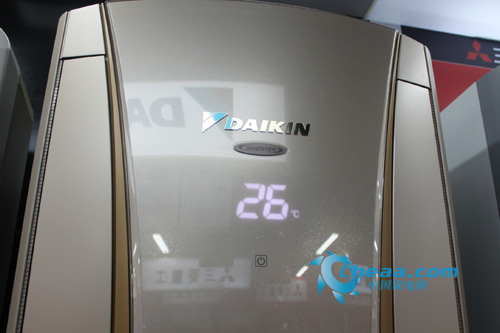 大金新冷媒柜机的隐形显示屏位于机身上部中央位置,空间开启,显示屏显示设定温度等指标,空调停止运行时,显示屏隐藏不露痕迹,时尚美观。