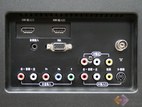 创维42L05HF液晶电视的接口都配备在机身左侧下方,机身背部的接口主要有2路HDMI高清接口、1路电脑VGA输入、1路S视频输入、2组视频输入、1组分量输入、1组视频输出、1组电脑VGA伴音输入及天线接口。