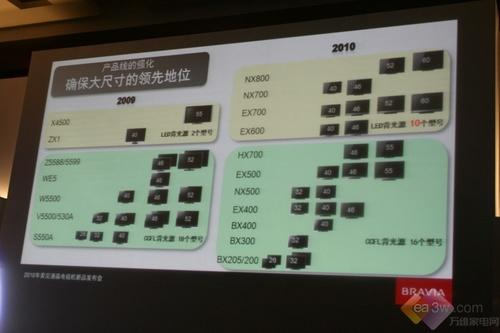 包括追求新锐体验的NX800/700/500系列,坚持画质为本的HX700系列、主流高清EX700/600/500/400系列以及入门级液晶精品BX400/300/200/205系列等共计11大系列26款电视新品。其中LED液晶电视共有四个系列,共计10个机型,在沉寂了1年之后,于2010年初,大举进军大尺寸LED液晶电视市场。