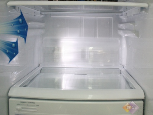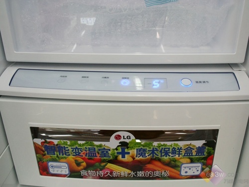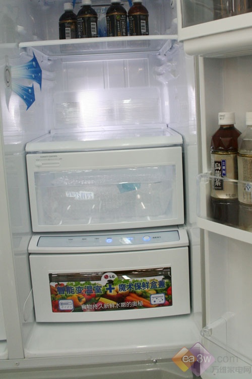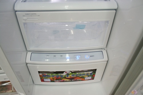 保鲜室的下部设置了湿度自调室和魔术保鲜盒两个功能性明显的分离盒。