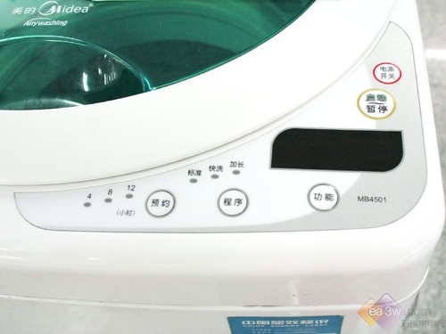 在操作面板方面,这款机器并没有采用一般波轮洗衣机惯用的形式,而是将数字显示屏和程序选择钮统统安排在操作面板的右下角,操作起来也比较省力。值得一提的是,美的MB4501并没有因为节约成本而没有配置显示屏,还是大手笔的配备了显示屏,操作起来更加方便。