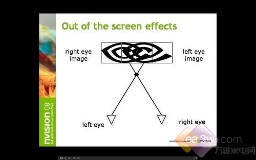 这项技术一般被称为“裸眼多视点”技术,也就是不通过任何工具就能让左右两只眼睛从显示屏幕上看到两幅具有视差的、有所区别的画面,将它们反射到大脑,人就会产生立体感。它也利用了人眼的视差原理,通过给观看者左右两眼分别送去不同的画面,从而达到立体的视觉效果。由于观察着可以不佩戴眼镜,因此这些技术非常适合在公共场所展示的大屏幕显示器,便于多人观赏。