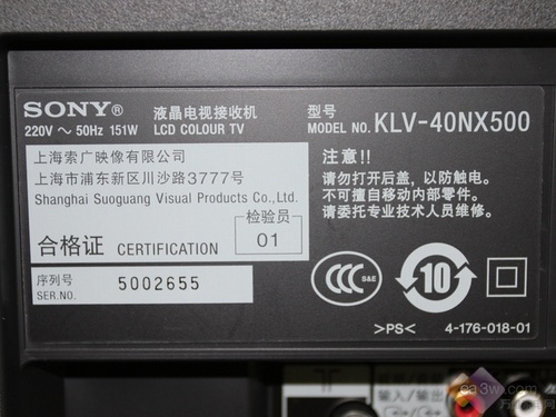 索尼 KLV-40NX500 生产厂:上海索广映像有限公司