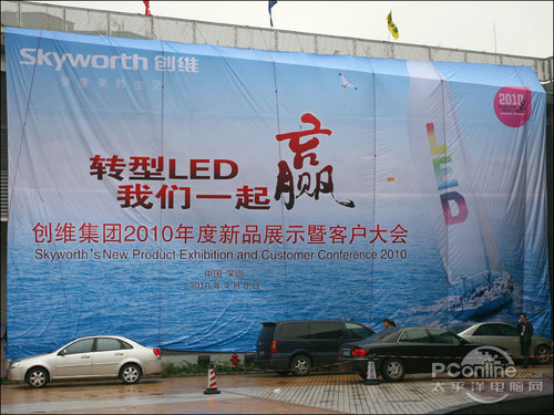 创维集团2010年度新品展示暨客户大会在深圳市福田体育馆举办,会场外悬挂着巨幅的宣传广告:“转型LED 我们一起赢”,宣示着创维将全面推进液晶电视从CCFL时代向LED时代转型,以及创维集团与客户共同发展的企业发展理念。