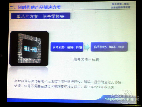 刘耀平总监指出,采用ALL-HD系统的酷开高清一体机拥有三个优势,一是外观设计简约、无须机顶盒;二是但芯片方案、信号零损失;三是一体化操作系统、只需一个遥控器。