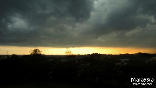 在去到马来西亚之前就对当地的天气情况有了一个了解,4月正值雨季,随时都会下雨。而当我们刚马来西亚,在前往吉隆坡的路上就体验到了。刚出机场时还是晴空万里,不到10分钟就已经乌云密布,下起了暴雨,而此时正值日落,于是就有了下面这张照片。