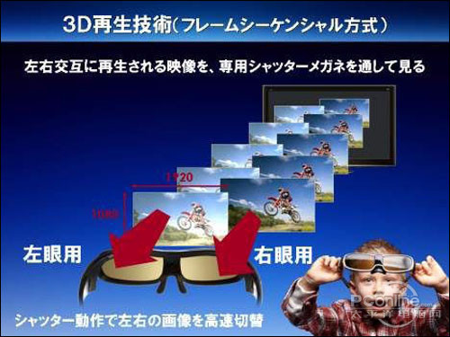 主动快门式3D技术采用的是提高屏幕刷新率的方式实现3D技术,这是对3D电视最基本的要求。从目前3D等离子电视和3D液晶电视屏幕端的实现形式来看,两者并没有区别,都是产生左右交替的画面以供进入观众的左右眼。以我国PAL制50Hz电视节目为例,每秒钟播放的画面达到50帧,而如果要实现3D技术,则必须至少提高一倍至100Hz,即左眼50Hz、右眼50Hz。