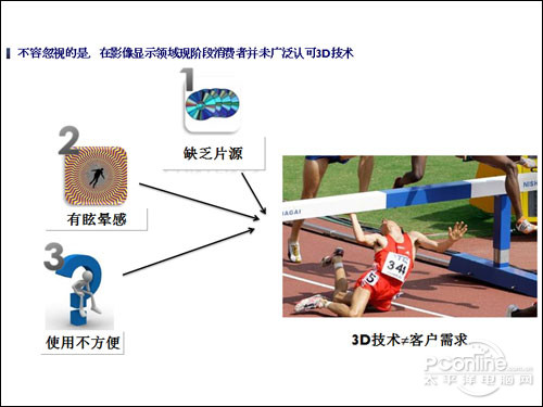 3D电视要走入寻常百姓家,仍然需要解决许多实际问题。首当其冲的就是片源问题,电视机买回家不是摆设,是要拿来看的,要观看到3D影像,仅仅有一部电视,一部3D蓝光机还是不够的,内容才是最重要的因素,虽然有些厂商推出买电视送大礼包的促销方案,但没有多少消费者会满足于永远只对着一部3D片源吧?3D内容的匮乏将大大影响3D电视的普及程度。